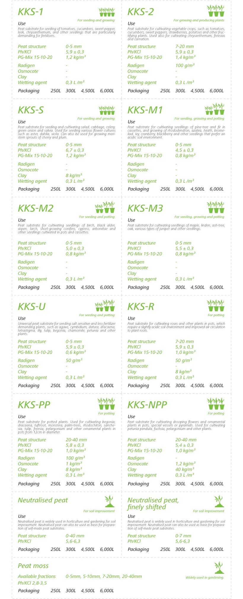 O uso de substratos de turfa como um meio ambiente de crescimento das plantas proporciona alta capacidade de água e de ar e a capacidade de isolamento da turfa optimiza a eluição de nutrientes. Na produção dos nossos substratos de turfa usamos uma mistura de turfa moída e turfa em blocos. A turfa em bloco tem melhores propriedades físicas - mais poros de ar, maior capacidade de absorção de água, estrutura natural mais bem preservada, assim como menor densidade aparente em comparação com a turfa moída. Entretanto, a turfa em bloco é mais cara e tem menor capacidade de troca permuta catiônica do que a turfa moída. Portanto, o uso de uma mistura de turfa moída e em bloco é a melhor solução para fornecer as propriedades necessárias às raízes das plantas em termos de nutrientes, água e acesso a ar. Em nossos substratos de turfa, utilizamos somente os melhores aditivos disponíveis fornecidos por produtores mundiais reconhecidos, tais como PG Mix (fertilizante básico), Osmocote e Manna Dur (fertilizantes de liberação lenta), Radigen (micronutrientes e fertilizantes de magnésio), Fiba Zorb (agente umectante para uma melhor capacidade de absorção de água, grânulos de argila ou argila em pó para uma melhor capacidade de absorção de água e capacidade ótima de troca de nutrientes. Compreendemos a alta importância da qualidade do meio ambiente de crescimento das plantas para os produtores profissionais. Por causa disso, focamo nossos esforços da na manutenção constante da alta qualidade dos nossos substratos de turfa. Nossos substratos de turfa são feitos usando uma linha de produção de substratos computadorizada. Durante o processo de produção dos substratos, são realizados rigorosos controles de qualidade e as amostras de cada lote são analisadas e armazenadas em nosso laboratório a fim de garantir que as propriedades de cada lote corresponda com precisão à receita do produto.